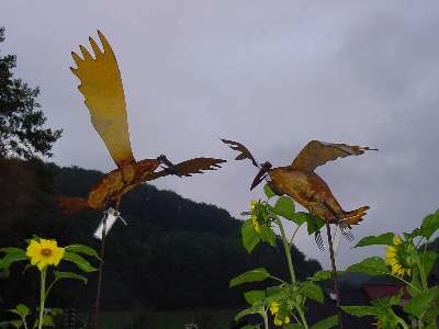 fliegender Vogel auf 2m langer Stange mit Füssen aus Besteck, rostend, von Karin und François Steinauer